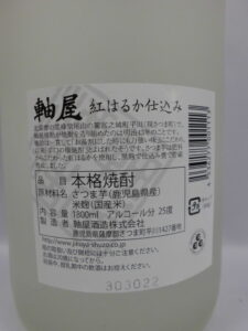 軸屋 紅はるか 25度 1800ml 軸屋 紅はるか 25度 1800ml (SC1090) 紫尾山の麓宮之城町」平川で軸屋権助が焼酎を作り始めたのが明治43年の事です。権助は一貫してお湯割りにしたとき力強い味を醸し出す焼酎造りにこだわりました。さつま芋は紅はるかを使用し昔ながらの甕つぼで仕込み甕で熟成しました。是非一度ご賞飲下さい。 【 原材料 】 さつま芋 米麹 【 度 数 】 25度 【 蔵 名 】 軸屋酒造 【 呑ん方 】 お湯割り◎ 水割り◎ ロック◎ 1800ml 在庫状態 : 在庫有り ¥3,300 ¥3,300(税別) ( 税込¥3,630 ) 数量本 関連商品 麗うるわし 25度 1800ml 四代目杜氏 軸屋麻衣 […] ¥2,545 ( 税込¥2,800 ) 裏軸屋 25度 1800ml 軸屋酒造2025裏軸 […] ¥2,909 ( 税込¥3,200 ) 甕仕込み 紫尾の露 25度 1800ml 北薩摩の霊峰紫尾山の […] ¥2,364 ( 税込¥2,600 ) 長期石蔵熟成紫尾の露 25度 1800ml 明治43年創業、10 […] ¥2,500 ( 税込¥2,750 ) 長期貯蔵酒 軸屋 25度 1800ml 長期甕貯蔵『軸屋』は […] ¥2,455 ( 税込¥2,701 )