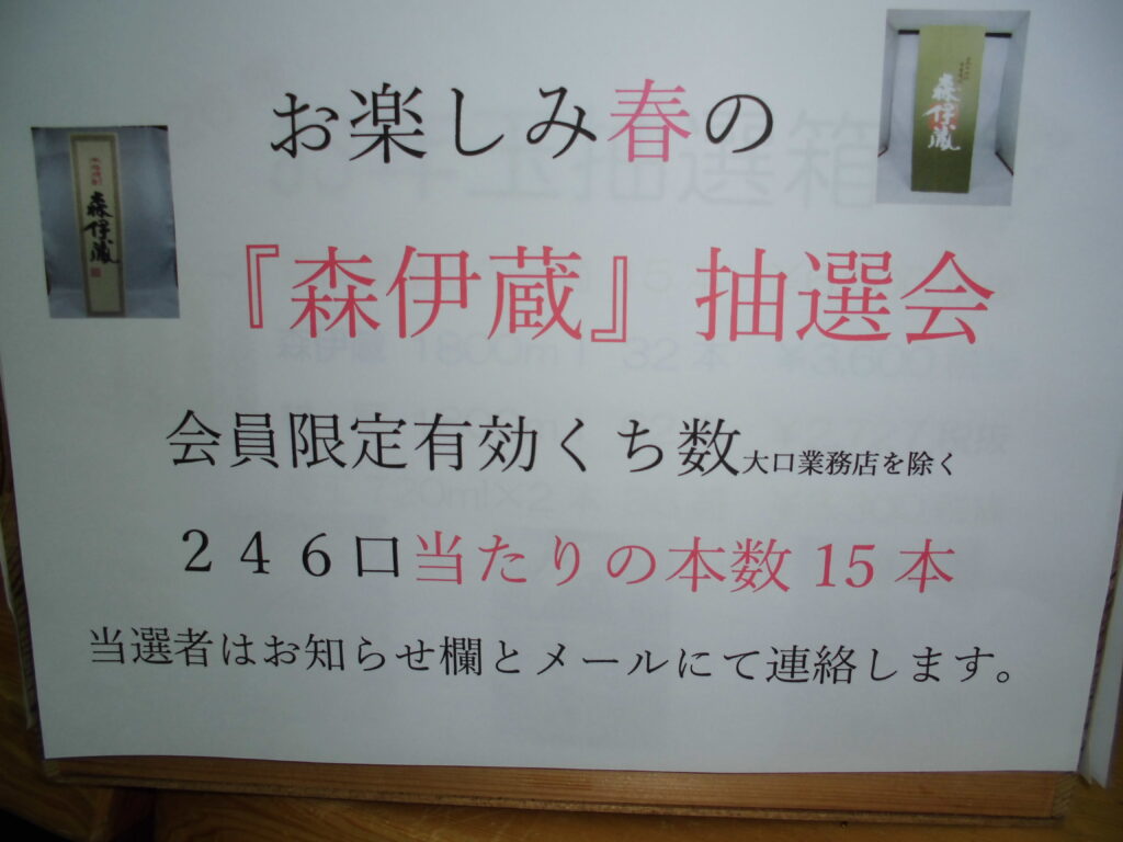 森伊蔵当選番号2026-04/05 2026-04-06 Filed under: お知らせ,イベント sadaharu 森伊蔵極上の一滴・B0001202722・B0001202736・B0001202723・B0001202742・B0001202740 森伊蔵1800ml・B0001202710・B0001202751・B0001202760・B0001202752・B0001202724・B0001202714・B0001202719・B0001202735・B0001202745・B0001202579の方々です。